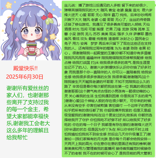 丝儿说:播了游戏以后遇见的人多啦 留下来的却很少弹幕英雄陪我玩的大大 随风 香宝 老婆 皇皇 追光 君六岁烽火逆天 心爱 哥哥 无心 陪伴 霸刀 纯纯,后来吵吵闹闹只剩下大大 随风 老婆 心爱 哥哥 无心了,丝丝的传奇路还换了修仙游戏,我遇见了很多善良可爱的人胡桃 天仙酒酒 时光 范闲 可羑 摇摆 芒果 刀锋 龙游 深海 孤单 玉簪 小杲 游民 龙儿 苏苏 美美 现实 强求 久伴 萨摩耶 墨伤南风 看戏 坟头 最暖 纯爸爸 渣渣辉 冰封之心 国民老公兔子 用力 安苒 梦梦 再后来只留下了现在这些还在支持我的人,还有陪我过周年的噬魂 为为 老婆 陈陈 老黑 初心 。很谢谢陪我一起殿堂的玉簪{你都不知道你有多温暖陪我风风雨雨 磕磕绊绊 陪我爬塔陪我双修帮我配修 给我占榜 给我打战国 打pk 给我很多很多的底气 是我生涯里忘记不了的人},谢谢六岁(新婚快乐认识你你换了好多对象 而我是那个你一直陪伴的人 你可以一直陪着我 给我安全感 给我很多很多惊喜的女孩 我很幸褔}谢谢随风{这个陪我接生天天喊我老婆的坏哥哥 不知不觉陪我这么久的路了 辛苦但是看你每次都把我放在第一位 我真的很欣慰)谢谢哥哥(这个脾气有点古怪的小男孩有一颗很幼稚的心灵 关心着我的生活 生怕我遇到困难 你是我活下去的底气}谢谢心爱(这个神秘人般的存在很少聊天,可你来的时候从来没有空手 你害怕被欺骗 害怕错付 一个这样子的男孩似乎把所有的信任都了我 你超级嫌弃我笨的 但是又是超级宠爱我的}谢谢纯纯(在这个更变过的礼物系统 你毅然选择给我开了守护 你怕我吃不好穿不好 所以给我买了好多吃的 你在的每一个日子 我都是有存在感的}谢谢烽火逆天{你半退的状态 但是因为你丫头在 所以你会时不时上线怕我尴尬怕我找不到安全感 然后这几天你升级藩王了}谢谢如一{我们家稀有的月光族 是你每个月都会给我安排一天两天上我的高光 你在意你在意的里面还有我的榜单}谢谢美美和用力{管理着我的直播间 接待着我睡觉时候接待不了的老板 我不在的时候可安心了 是我目前的两大管家)